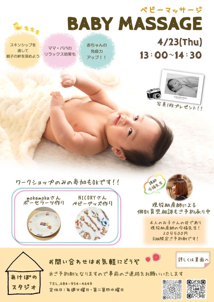 ベビーマッサージの内容は、こちらを御覧ください 同時開催のワークショップ内容は、こちらを御覧ください